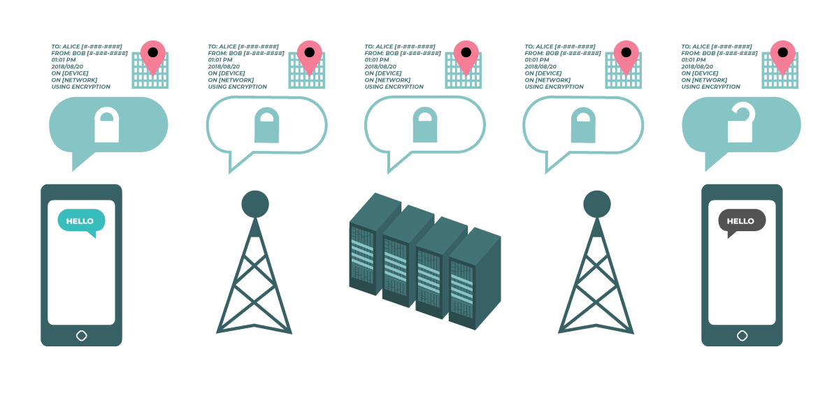 แผนภาพแสดงข้อมูลขณะส่งผ่านที่ไม่ได้มีการเข้ารหัส—ซึ่งมักจะเป็นไปตามการตั้งค่าเริ่มต้นของผู้ให้บริการอินเทอร์เน็ต สมาร์ทโฟนทางด้านซ้ายจะส่งข้อความสีเขียวที่ไม่ได้มีการเข้ารหัสไปยังสมาร์ทโฟนอีกเครื่องทางด้านขวาสุด ในการส่งผ่านข้อความ หอสัญญาณโทรศัพท์มือถือจะส่งผ่านข้อความไปยังเซิร์ฟเวอร์ของบริษัท จากนั้นจะส่งผ่านไปยังหอสัญญาณโทรศัพท์มือถืออีกแห่ง ซึ่งหอส่งสัญญาณแต่ละแห่งสามารถเห็นข้อความ “Hello” ที่ไม่ได้มีการเข้ารหัสไว้ คอมพิวเตอร์และเครือข่ายทั้่งหมดที่ส่งผ่านข้อความที่ไม่ได้ถูกเข้ารหัสจะสามารถเห็นข้อความดังกล่าว ท้ายสุด สมาร์ทโฟนอีกเครื่องจะได้รับข้อความ “Hello” ที่ไม่ได้มีการเข้ารหัส